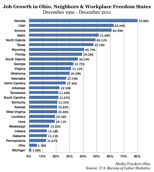 Job creation in Ohio lagged far behind all 22 workplace freedom states from 1991 to 2011, according to U.S. Bureau of Labor Statistics (BLS) records. Without cherry-picking data as union bosses must in order to defend forced unionism, total seasonally adjusted non-farm employment growth shows a huge advantage for residents of right to work states.