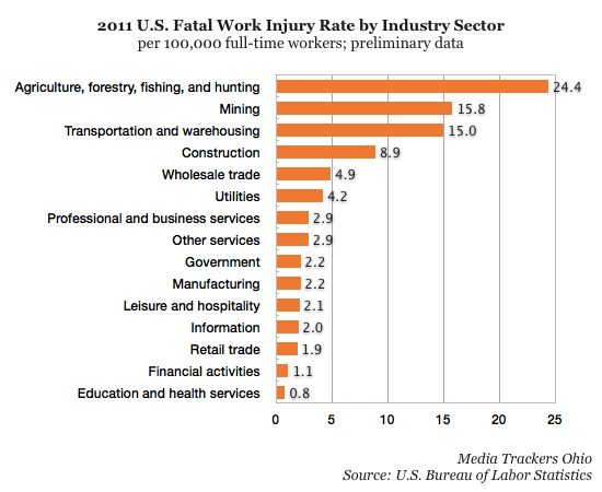 The U.S. Bureau of Labor Statistics (BLS) tracks fatal work injuries by industry sector, and preliminary 2011 figures show a huge variation in fatality rates for different types of work.