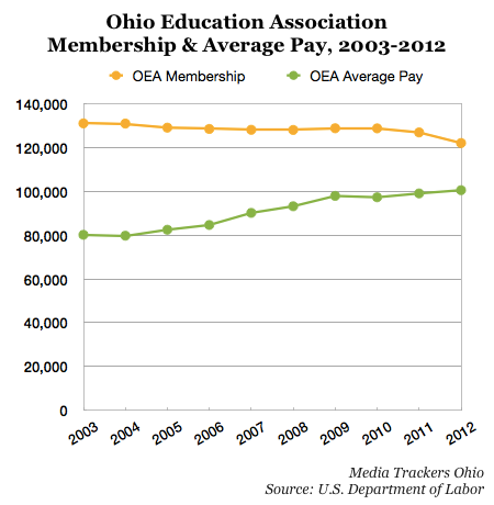 The average pay of Ohio Education Association (OEA) employees increased by 25 percent between 2003 and 2012 while the union’s membership shrank by nearly 7 percent. During the same period, annual OEA dues charged to teachers increased by 25 percent.