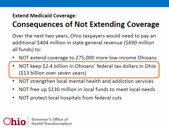 An official summary of the governor’s February 4 biennial budget proposal also asserted that expanding Medicaid eligibility “avoids leaving Ohioans’ federal tax dollars on the table and keeps the federal government from simply giving them away to other states.”