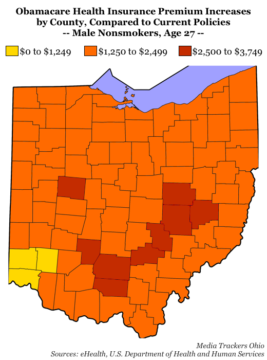 In 9 Ohio counties, Obamacare will increase annual health insurance premiums for 27-year-old male nonsmokers by $2,500 or more. In 3 counties, Obamacare will increase premiums by an estimated $1,199.