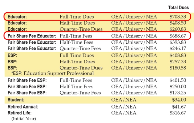 Teachers in school districts organized by the Ohio Education Association (OEA) are charged $703.33 per year for union membership, and can be forced to pay $688.67 in annual “fair share” fees if they decline to join the union.