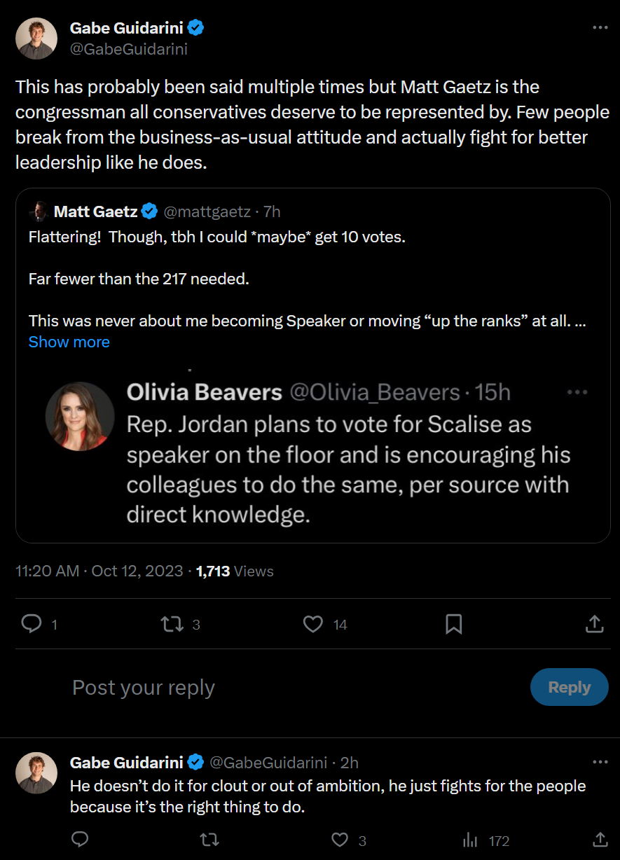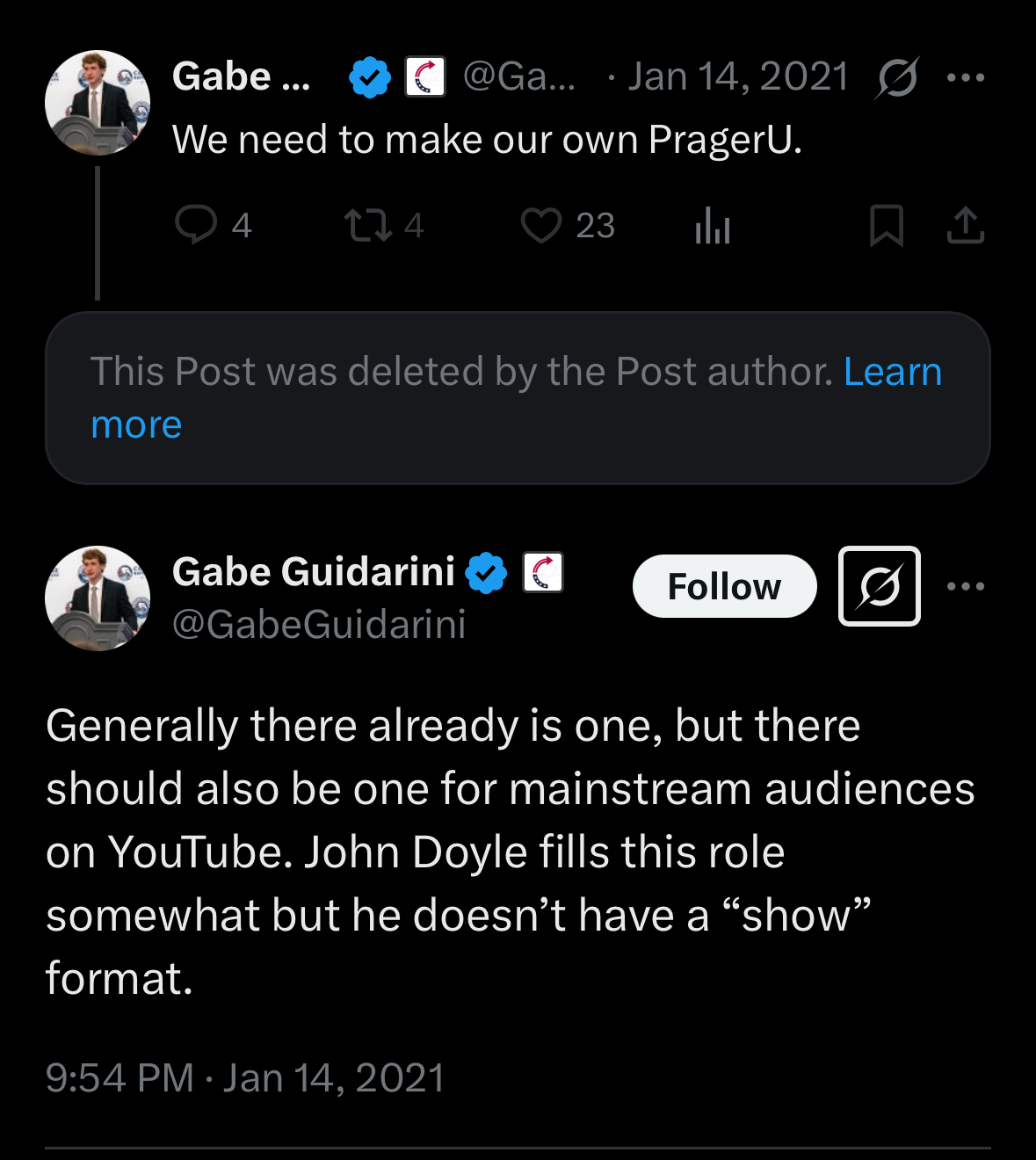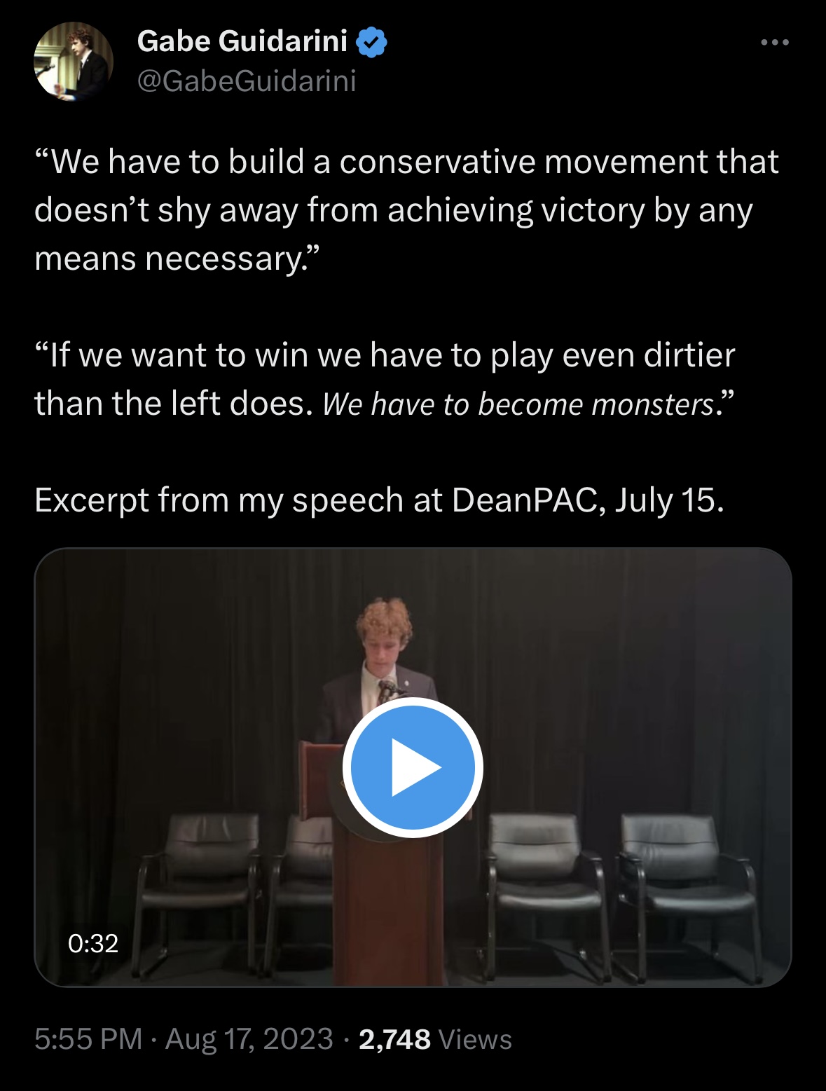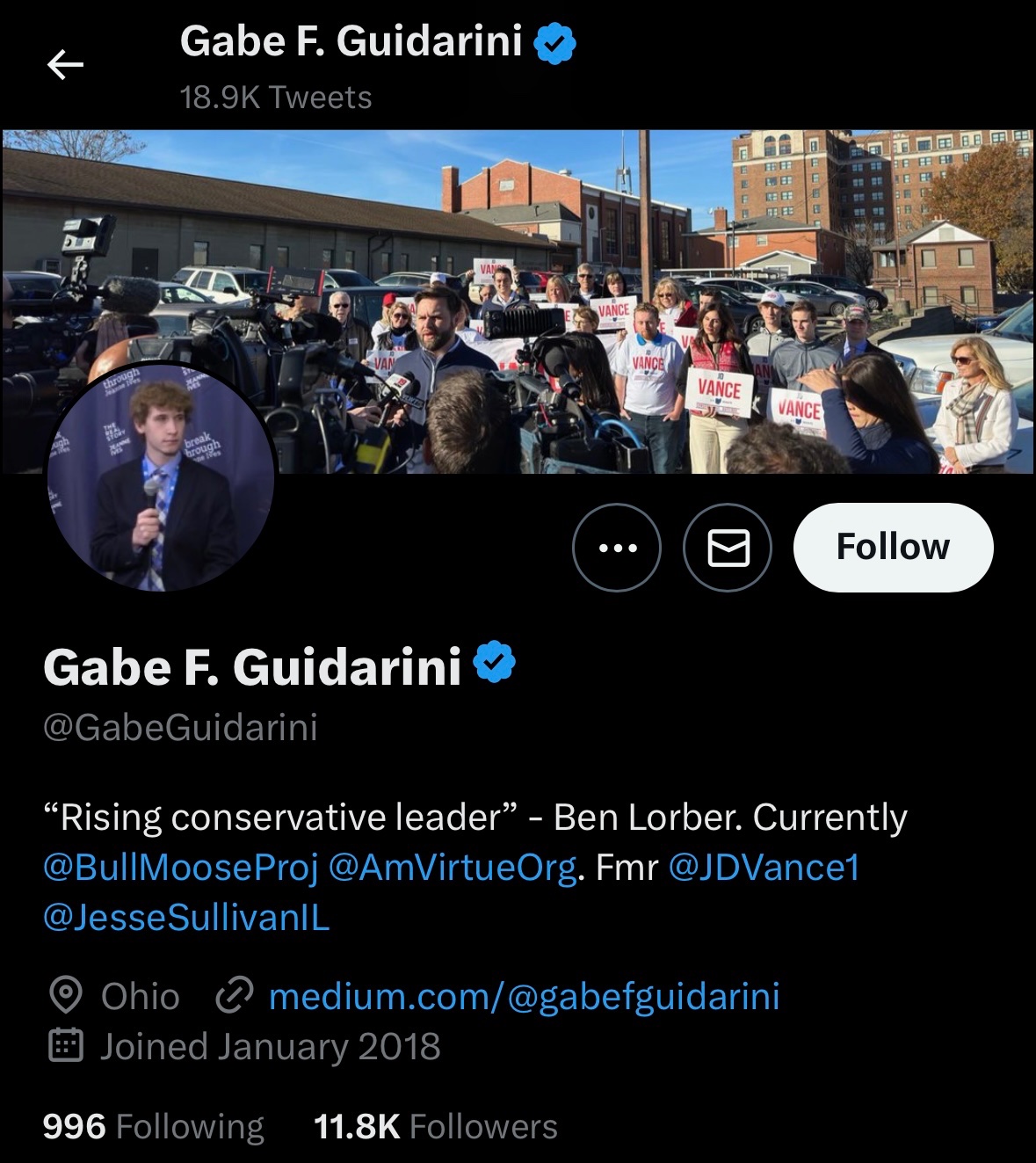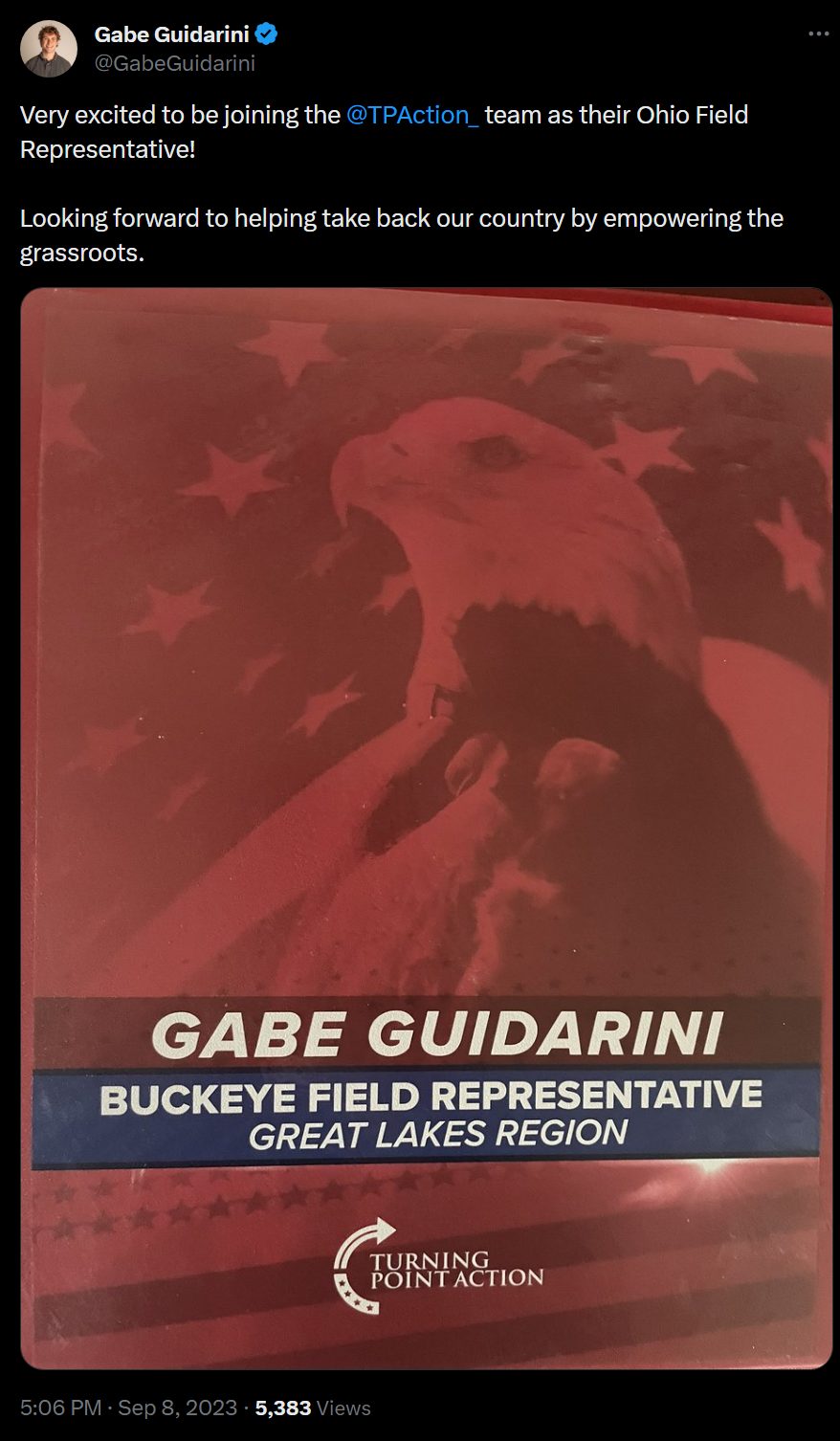 Joining Doyle in endorsing a September 2023 campaign to ban the Anti-Defamation League from Twitter (to quote Doyle, the ADL is run by “Jews retard google it”) was Gabe Guidarini, a former APU & Bull Moose Project staffer who now works for Turning Point Action and College Republicans splinter group College Republicans of America: